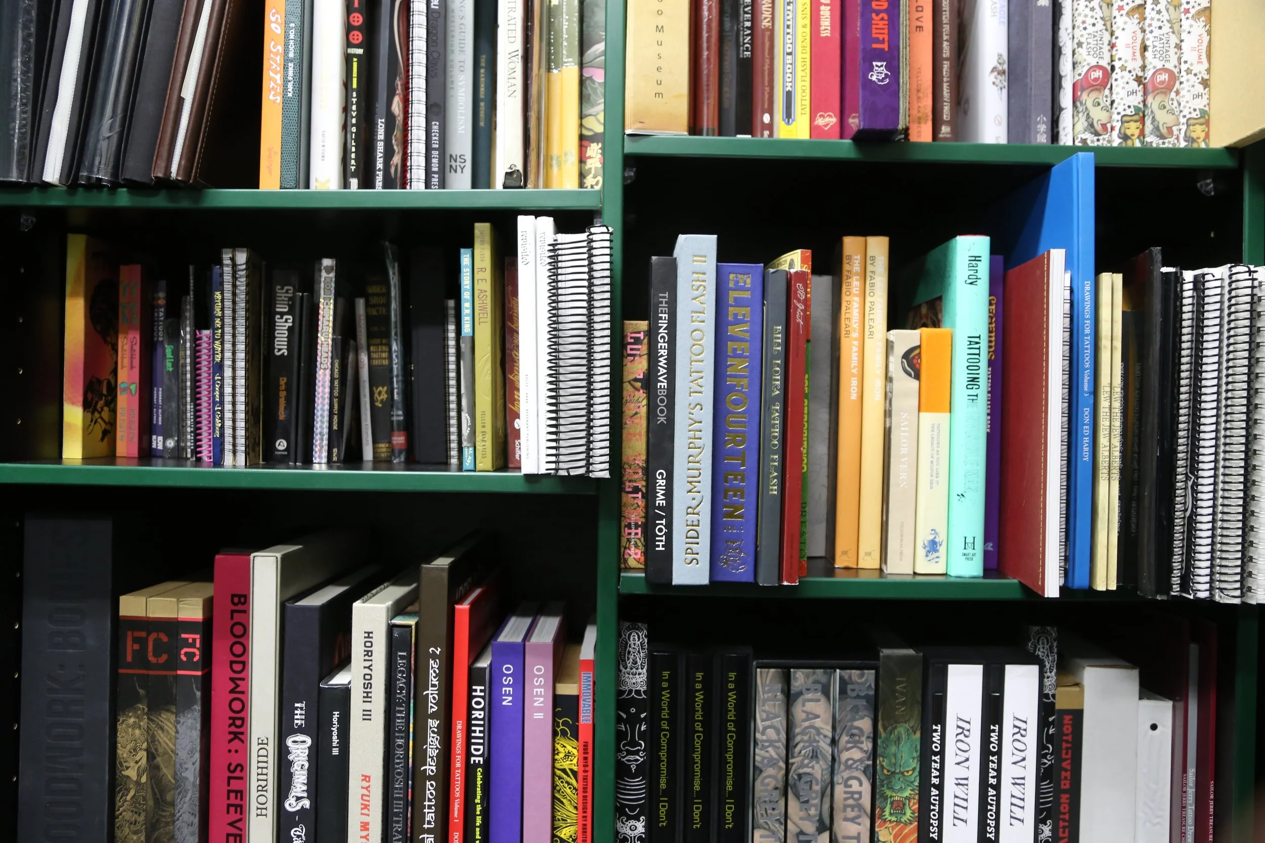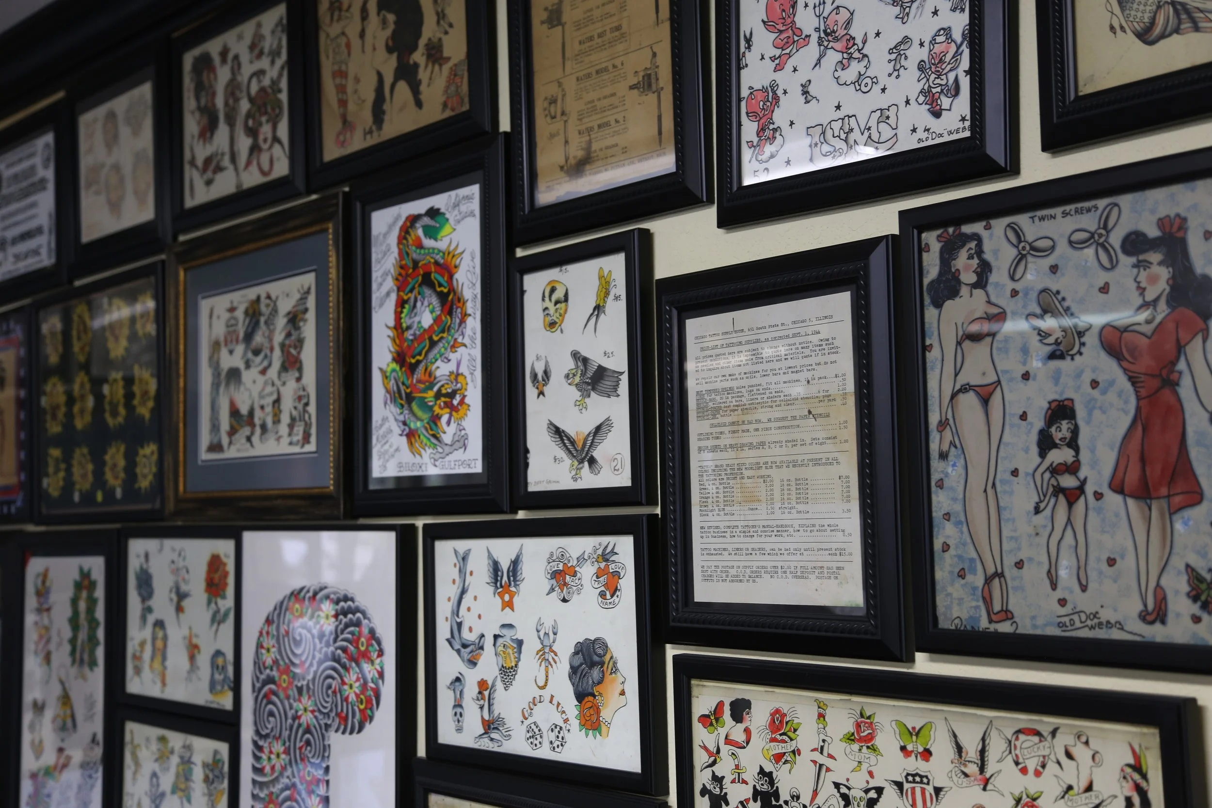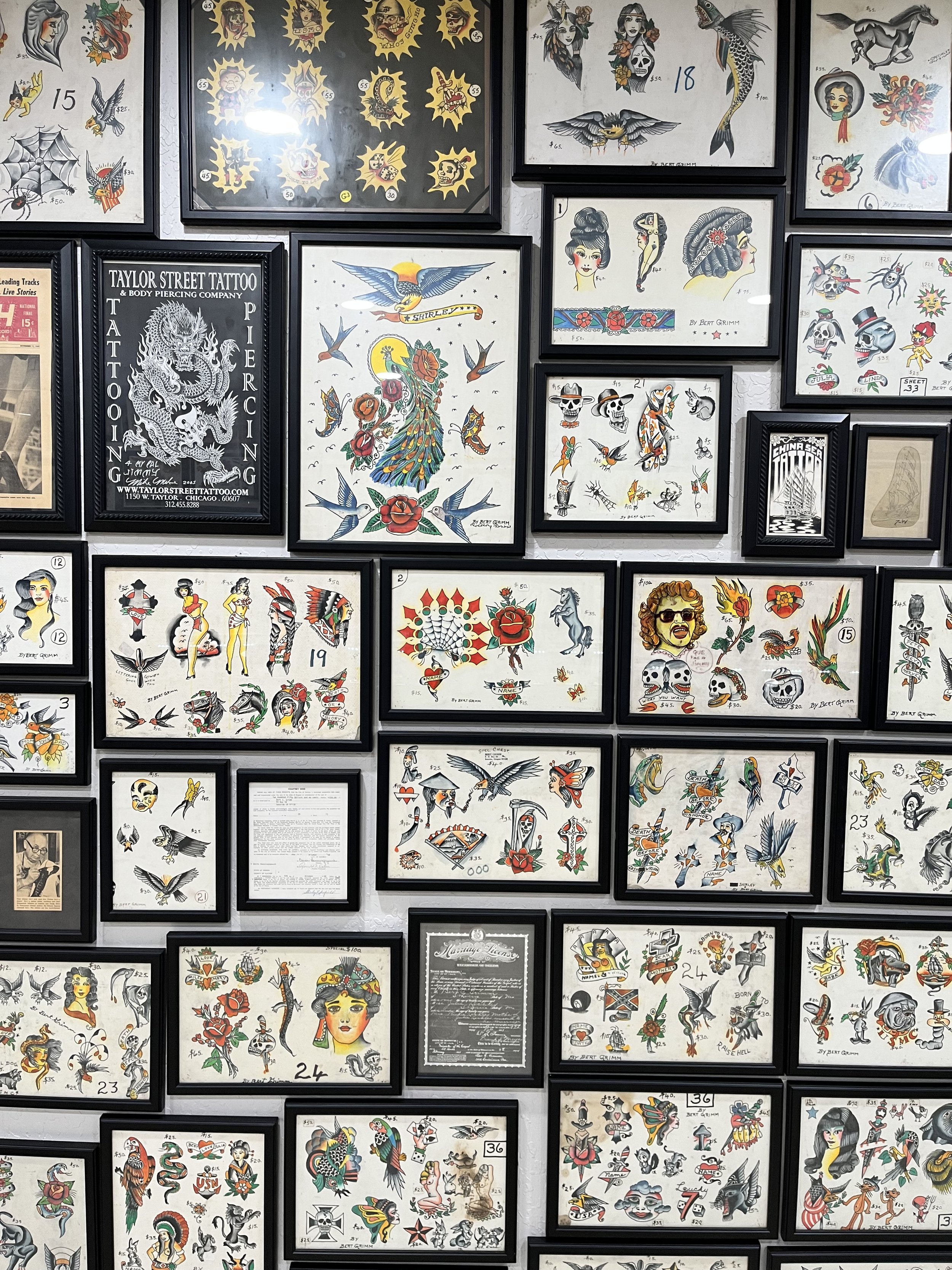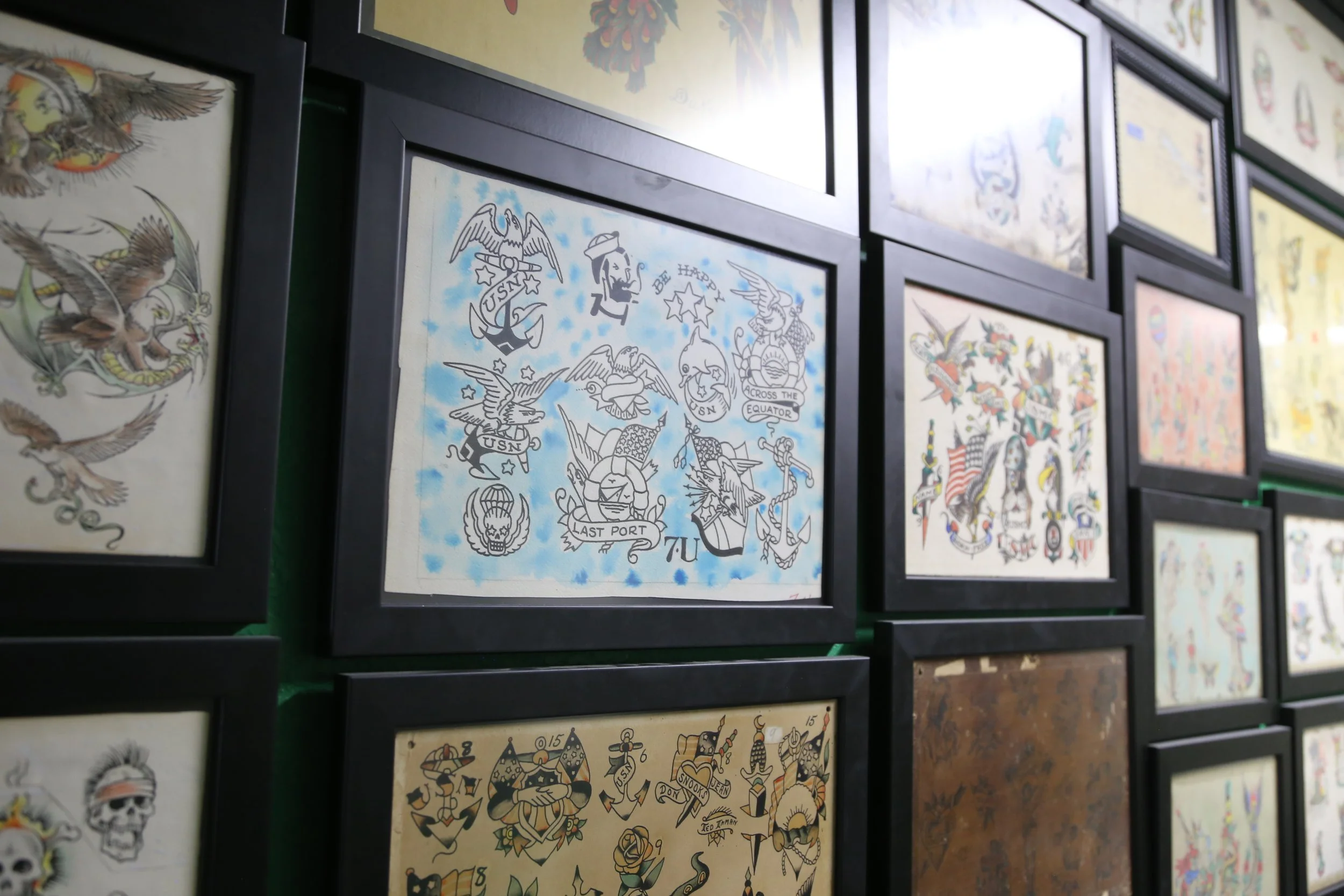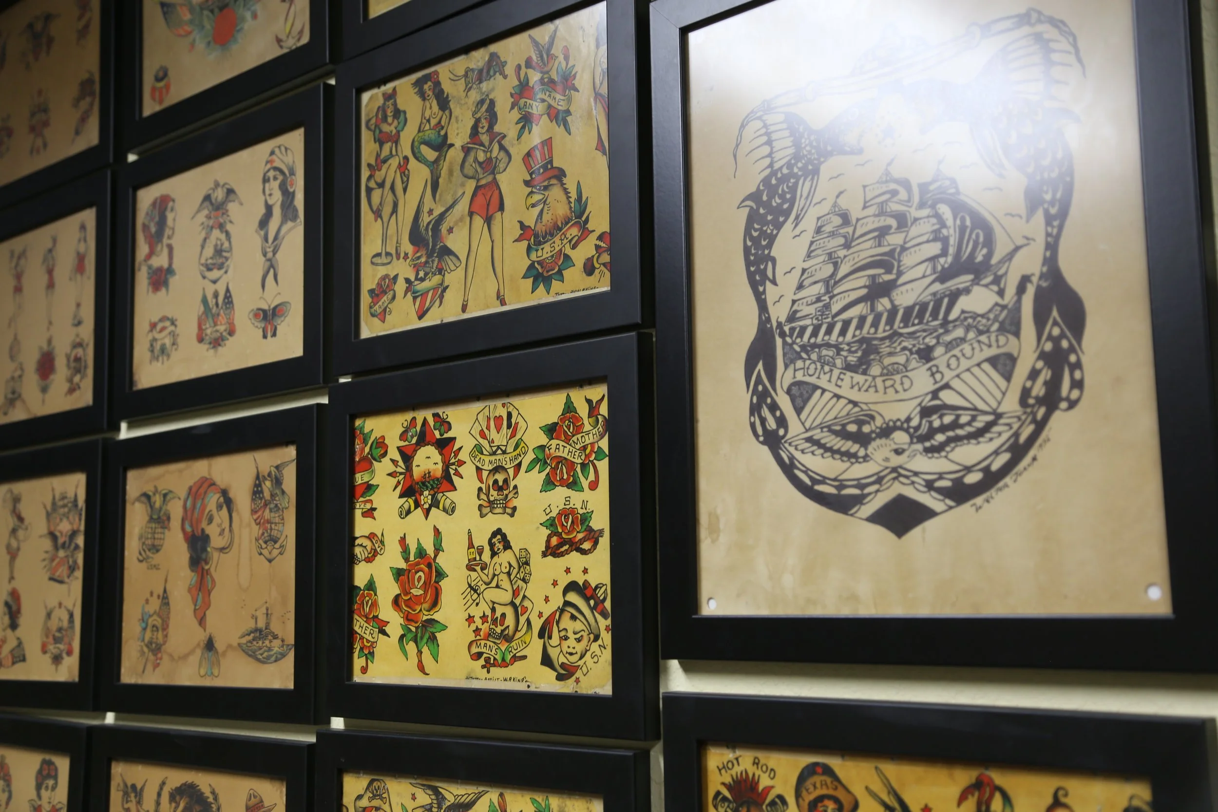 From wall to wall, the LS Tattoo Museum is covered from ceiling to floor with various pieces of art and flash collected over the years, dating from the early 1900’s to present day. Spend time immersed in our two-story wall to wall gallery, where you can see works by artists such as “Sailor Jerry” Collins, Bert Grimm, Bob Wicks, Lyle Tuttle, Owen Jensen, Paul Rogers, Percy Waters, Mike Malone, Huck Spaulding, W.R. King and many more!